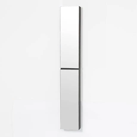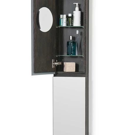This stylish slimline tall mirror cabinet is a great addition for any modern bathroom. It’s slimline design makes it ideal for bathrooms where space is limited. The cabinet can be mounted for either left or right hand door opening and houses six adjustable tempered glass shelves. The cabinet also features a 5x magnification mirror on the top doors internal side for a close up view. Beautifully crafted from white oak and oak veneers and finished with a dark stain water resistant lacquer.