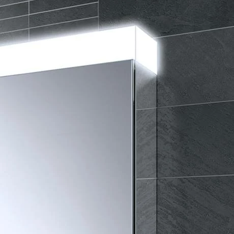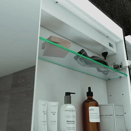 The HIB Apex 80cm double door bathroom mirror cabinet with LED illumination, mirrored sides and two charging sockets.