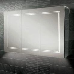 The HIB Edge 120cm bathroom mirror cabinet with LED illumination, demister and charging socket. With its mirrored doors and side panels, Edge is designed to reflect and radiate light on every surface.