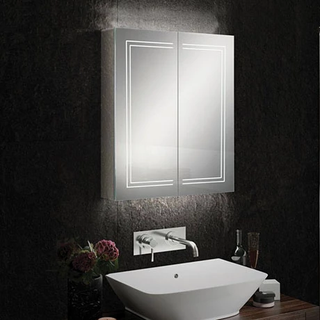 The HIB Edge 60cm bathroom mirror cabinet with LED illumination, demister and charging socket. With its mirrored doors and side panels, Edge is designed to reflect and radiate light on every surface.