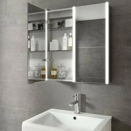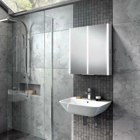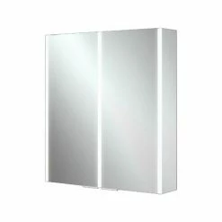 The Xenon LED Mirror Cabinet is a stylish 60cm double door cabinet with LED vertical illumination and a mirror profile that reflects the wall or tiles, so the mirror matches the style of your bathroom. It features an integrated charging socket for toothbrushes, shavers and trimmers, soft closing double sided mirror doors allowing you to use a mirror when the doors are open and a sensor switch so the light is simply turned on and off by a simple wave of your hand. The mirror is IP44 rated which makes it suitable and safe for use in the bathroom.