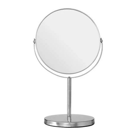 This stylish cosmetic mirror is attached to a u-shaped sling that allows it to be positioned at various angles. One side of the round mirror has a double magnifying surface, helping to achieve greater accuracy when shaving or applying makeup. Its thick round stand has a foam covering on its base to protect surfaces from being scratched by the metal.